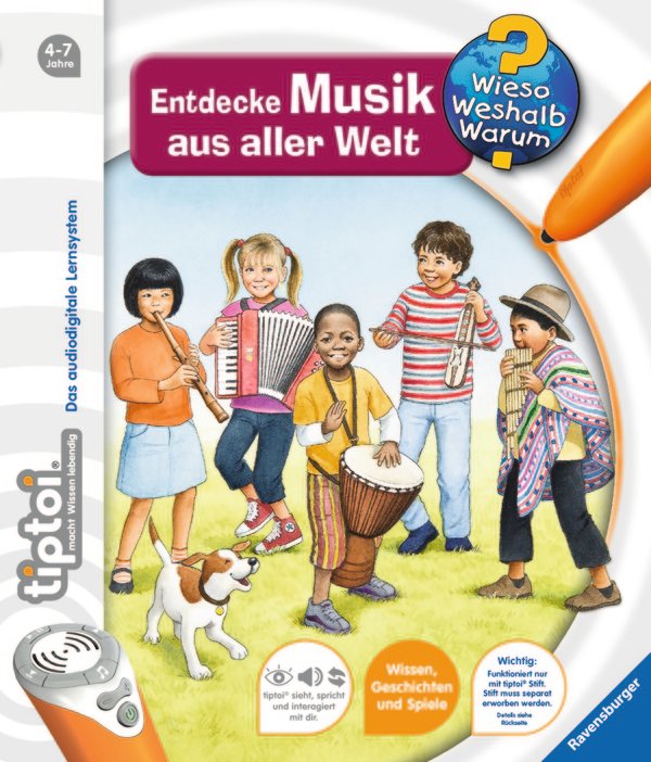 Mit tiptoi® unternehmen Kinder eine musikalische Reise rund um die ganze Welt und lernen dabei typische Instrumente, Musikstile und Tänze kennen. Wie klingt ein indonesisches Gamelanorchester? Warum wird in Afrika viel getrommelt? Wie hört sich ein Alphorn oder ein Dudelsack an? Die Musiker kommen auch selbst zu Wort und berichten darüber, was die Musik ihnen bedeutet und zu welchen Anlässen sie gespielt wird. Drei fremdsprachige Kinderlieder laden zum Mitsingen ein. Funktioniert nur mit tiptoi®* Stift.